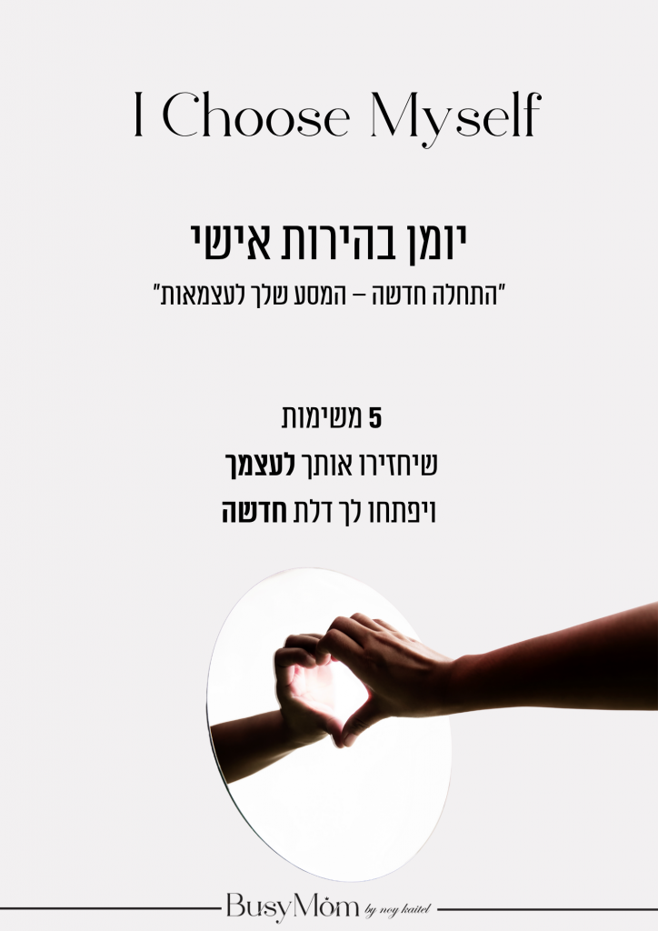 לחצי על הכפתור כאן למטה כדי להוריד את יומן הבהירות החינמי "אני בוחרת בעצמי". מלאי את הפרטים ותתחילי את המסע שלך בחזרה אלייך – צעד אחר צעד, בקלות ובנוחות.