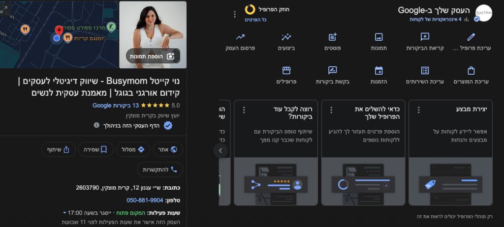 הפרופיל העסקי (GMB) הוא מה שמזין את המידע שמופיע על גבי המפה של גוגל. בלי פרופיל מאומת, לא תופיעי כ"סיכה" על המפה.